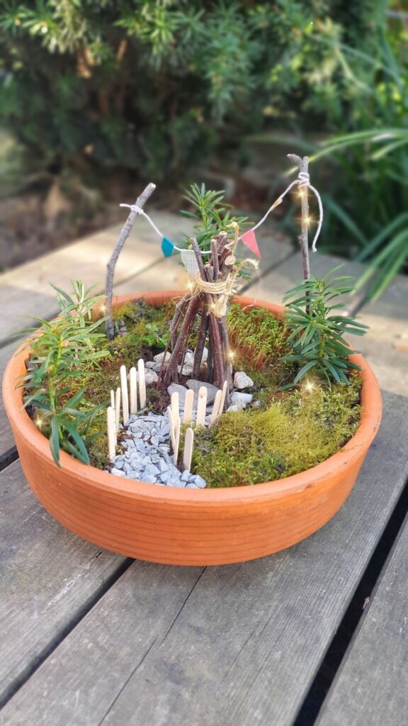 Du befüllst dein Gefäß mit Schichten aus Sand, Kies und Erde. Mal gerade, mal schräg- ach, und vielleicht auch mal farbig! Lass deine Fantasie spielen und richte es mit selbst gebastelten Accessoires, wie Tippi, Wippe oder Zaun ein. Suche dir deine grünen Bewohner aus und setze sie nach deinen Vorstellungen dazwischen. Dazu noch zauberhaftes Licht und schon hältst du deinen eignen kleinen Garten in den Händen.